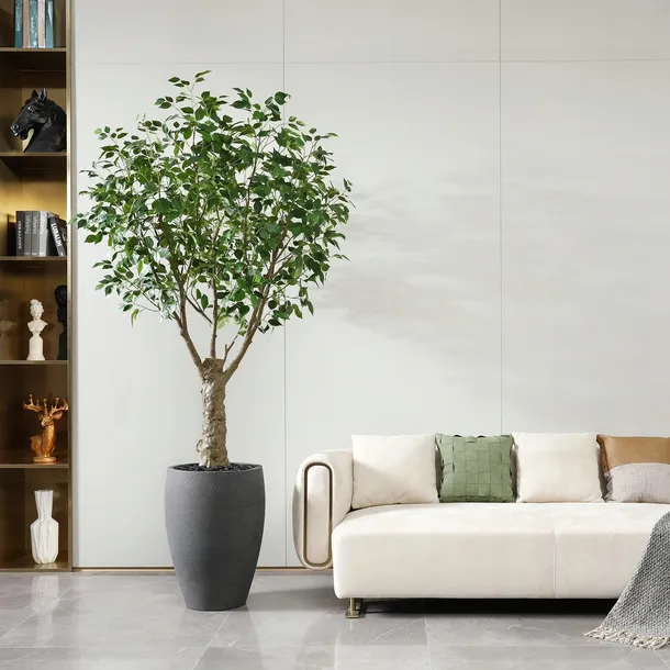 Sztuczne drzewko figowe (fikus) o wysokości 240 cm zostało zaprojektowane z dbałością o detale. Gęste, starannie odwzorowane liście oraz naturalnie wyglądający pień sprawiają, że roślina prezentuje się jak żywa.